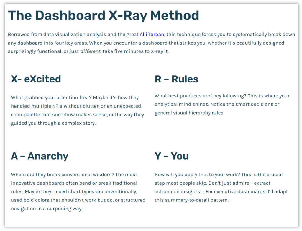 X-Ray your way to better dashboards: A framework for learning from great design  As dashboard developers, we’re in the trenches every day – building Power BI or Tableau reports, wrestling with calculations, adjusting layouts based on stakeholder feedback. We know the technical challenges: making slicers work smoothly, optimizing load times, cramming multiple metrics into limited […]